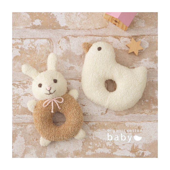 ふんわりパイル生地を使用したうさぎとことりのがらがらです。