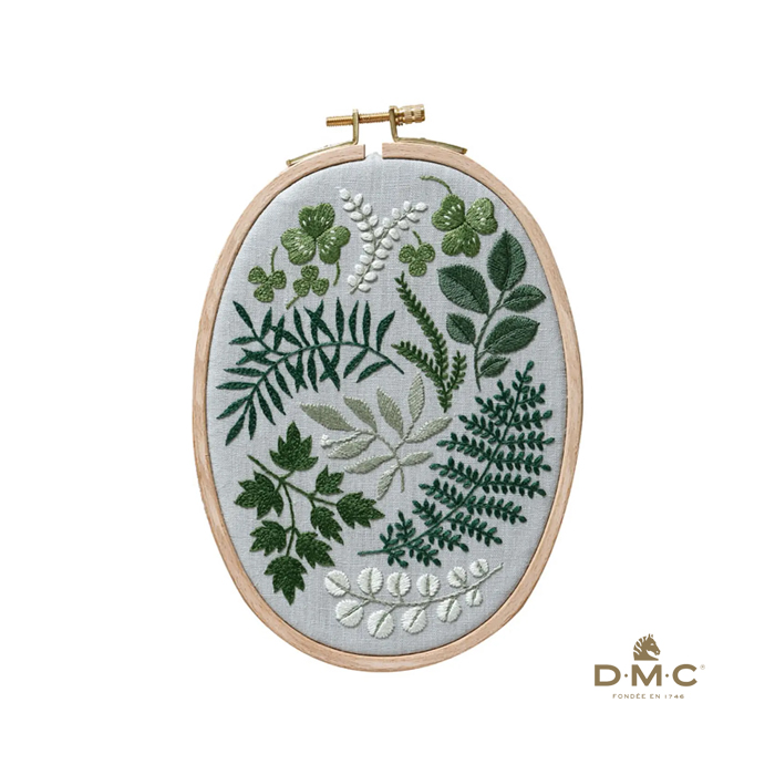 冬から目覚めたみずみずしい草木の葉を刺繍枠にとじ込めてシンプルな淡い色合いで表現。
