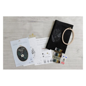 布はベルギーLIBECO・LAGAE社製の高品質リネンに図案をプリントし、トルコでオリジナル生産した高級感のあるオーバル型の刺しゅう枠をセットしました。