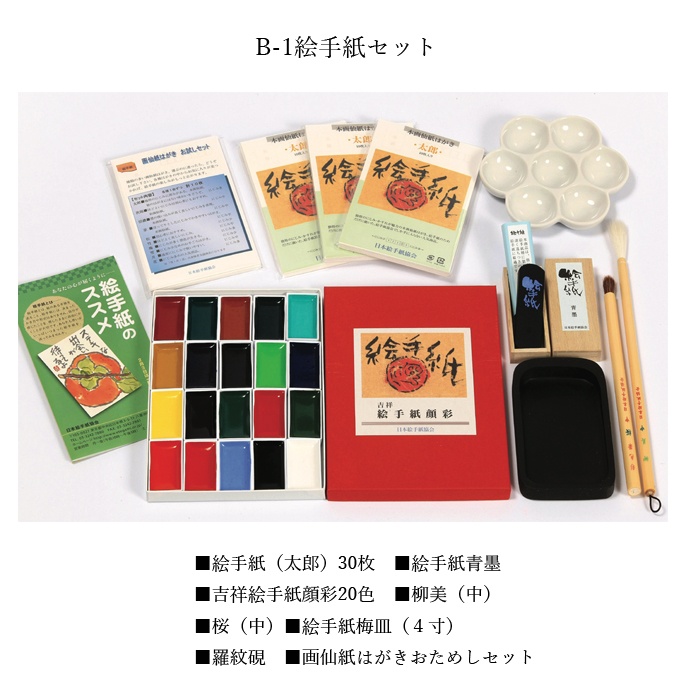 B-1 絵手紙セット B-1 絵手紙セット (tkit-etk-ek-1021) 「絵手紙をかいてみたいけど・・・道具選びが難しそう」 そんなとき、基本の絵手紙セットで迷わずトライ。 京都の老舗メーカー「吉祥」の顔彩を中心にした 通常価格10,362円がセット割引価格9,020円とお得です。 【セット内容】 ・絵手紙(太郎)30枚 ・絵手紙青墨 ・吉祥絵手紙顔彩20色 ・柳美(中) ・桜(中) ・絵手紙梅皿(4寸) ・羅紋硯 ※「画仙紙はがきおためしセット」「絵手紙のススメ」付き 宅急便60㎝サイズ。 表示価格はB-1絵手紙用セット1組の商品価格です。 在庫状態 : 在庫有り ¥8,200(税別) ( 税込¥9,020 ) 数量×1組