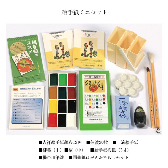 絵手紙ミニセット 絵手紙ミニセット (tkit-etk-ek-1031) 気軽に絵手紙をはじめたい方に! 絵手紙の基本がすべて揃った、お得なミニセット このセットがあれば、すぐに絵手紙を始められます。 初心者の方や、まずは気軽に試してみたい方にぴったりの内容です。 通常価格6,987円がセット割引価格5,720円(税込)と単品購入よりもお得です。 【セット内容】 □吉祥絵手紙顔彩12色 □信濃20枚 □一滴絵手紙 □柳美(中) □桜(中) □絵手紙梅皿(3寸) □携帯用筆洗 ※「画仙紙はがきおためしセット」「絵手紙のススメ」付き 宅急便60㎝サイズ。 表示価格は絵手紙用セット1組の商品価格です。 在庫状態 : 在庫有り ¥5,200(税別) ( 税込¥5,720 ) 数量×1組