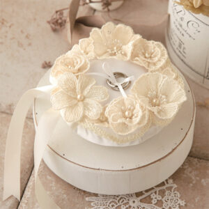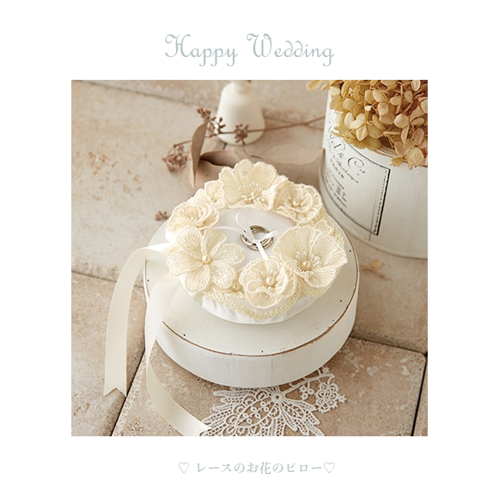 丸型のピローにレースの花びらをボンドでつけていくだけで、アンティーク風のフラワーリングピローが簡単に作れます。