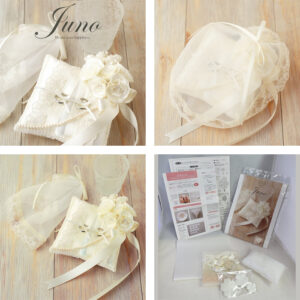 型抜き済みの花びらをボンドでつけていくだけ。サテン生地のフラワーモチーフが簡単に。