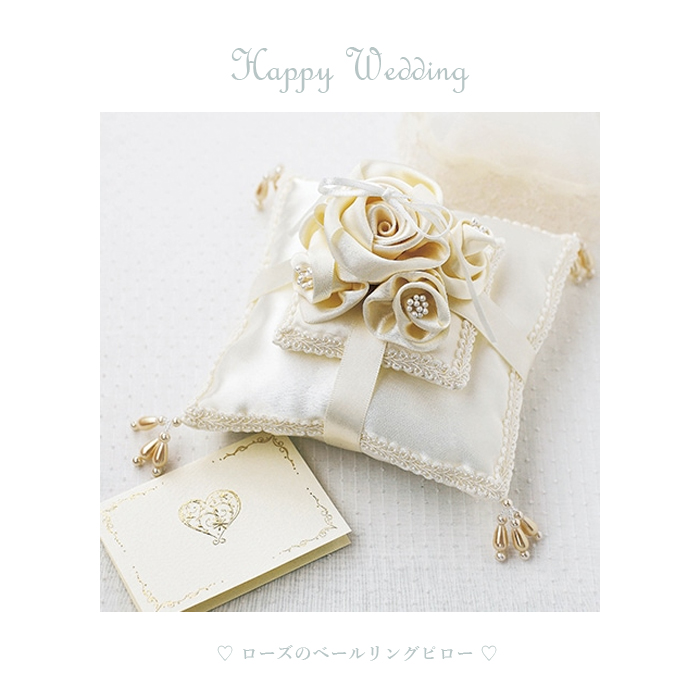 ローズの花束をあしらい、ベールを添えた二段重ねのリングピロー。
